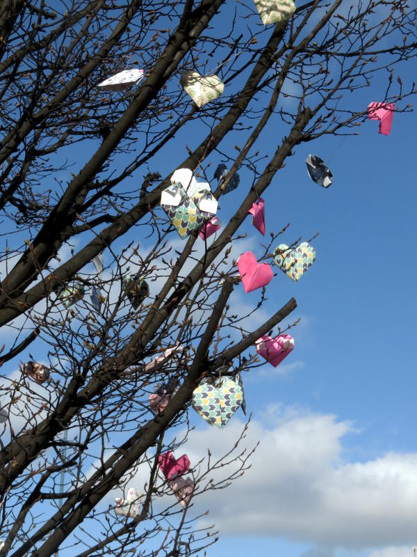 Origami hearts brighten up a barren tree for Valentine’s Day
